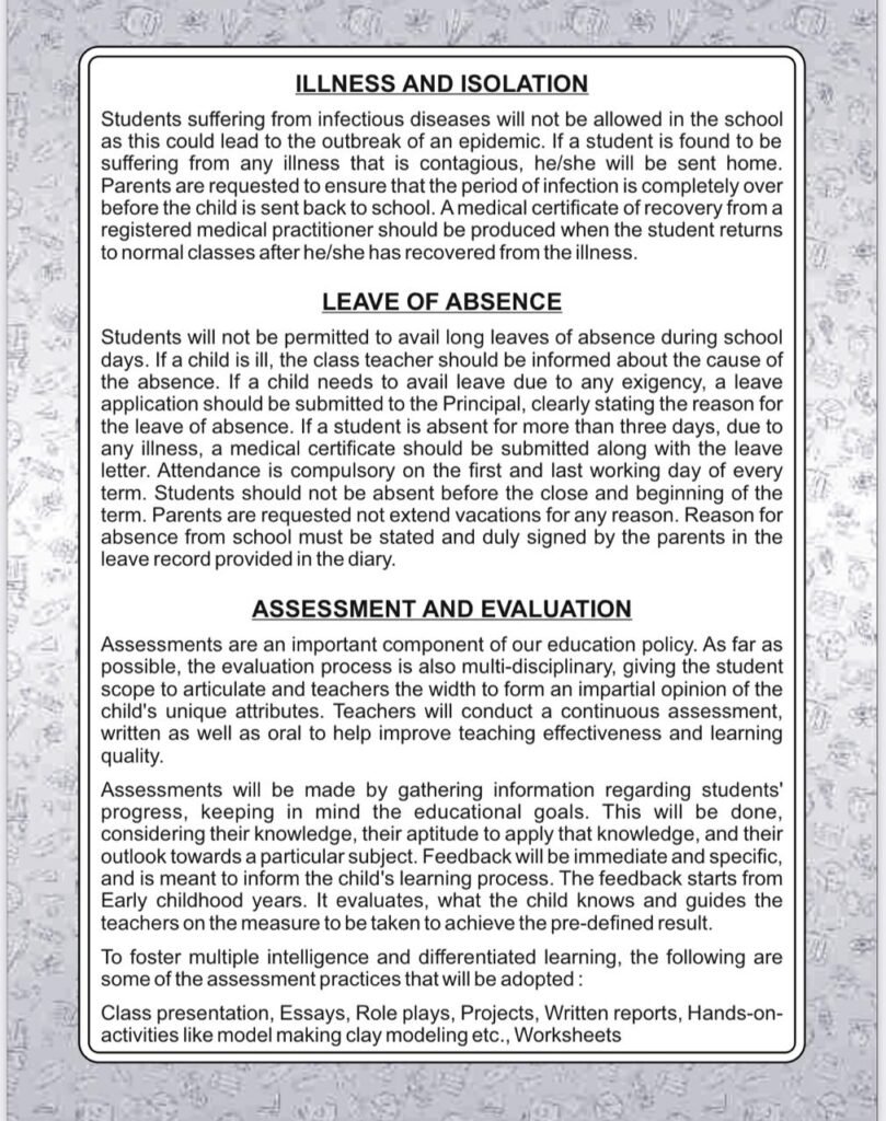 - Presence in the morning assembly is essential for every student. Complete silence has to be observed in the Morning Assembly. After the assembly is over, Students are expected to go to their respective classes in an orderly manner.
